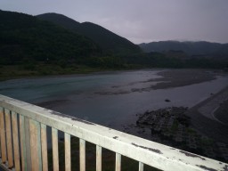 | 5時前です。明るくなってきましたが、雨はまだ降っています。 万栄橋を渡ります。川は富士川です。身延まで左岸の県道を遡上します。 | |